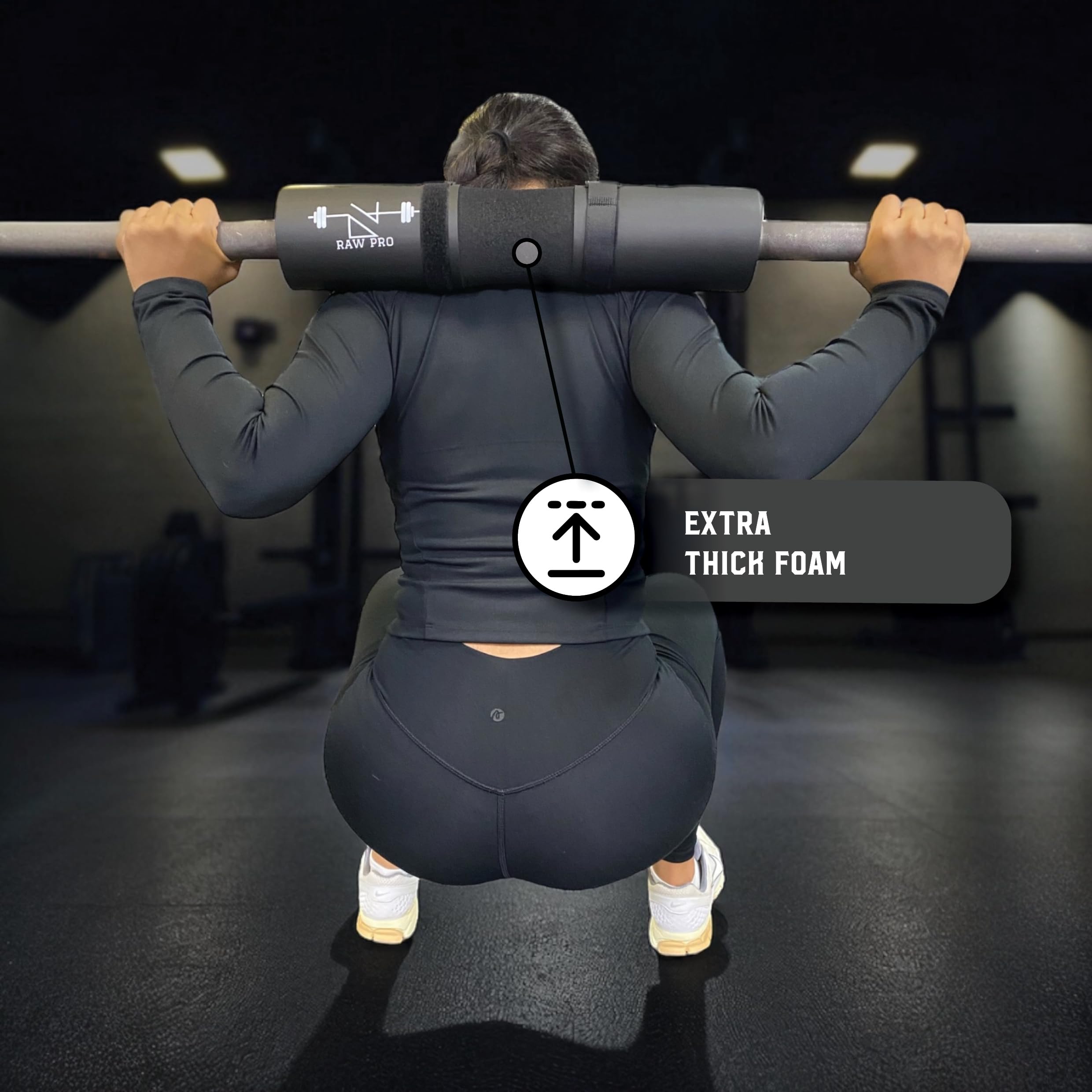 - Comfortable Foam Cushioning – High-density foam absorbs impact and reduces pressure on your neck, shoulders and hips during squats and hip thrusts.
